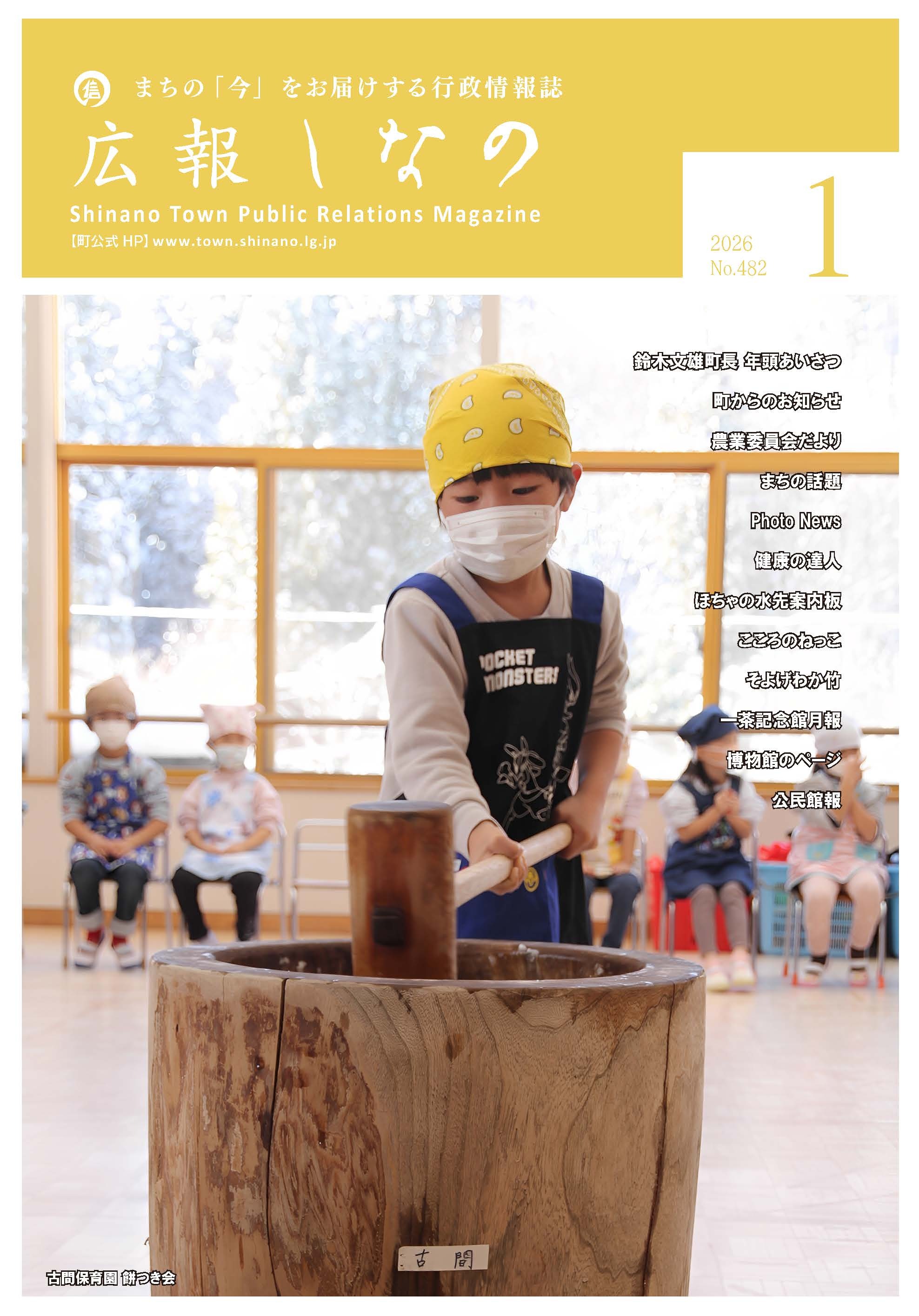 広報しなの令和8年1月号 表紙:古間保育園 餅つき会 全ページ (PDF 9.01MB) 鈴木文雄町長 年頭あいさつ 町からのお知らせ まちの話題 フォトニュース 健康の達人 ほちゃの水先案内板 こころのねっこ そよげわか竹 一茶記念館月報 博物館のページ 公民館報