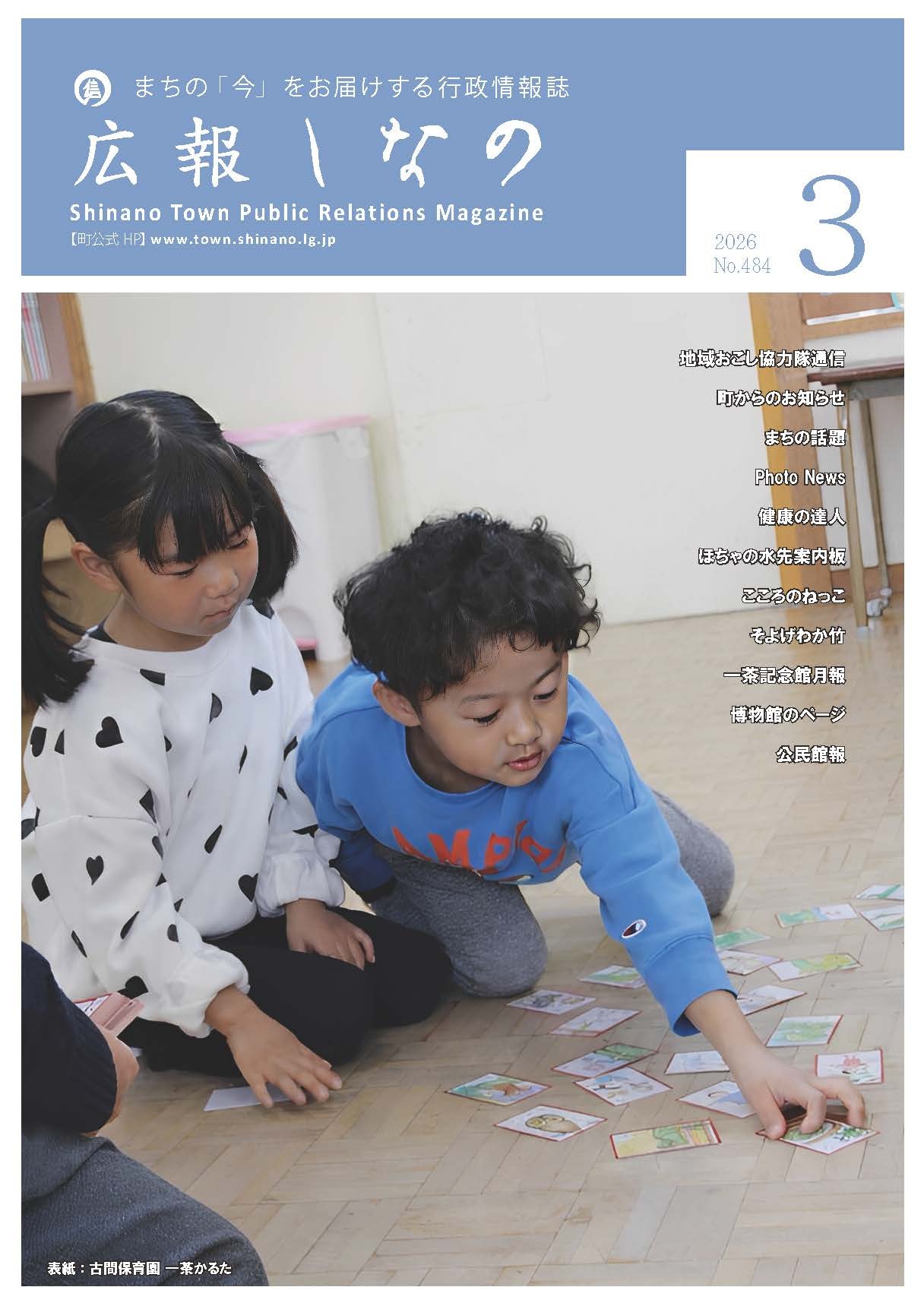 広報しなの令和8年3月号 表紙:古間保育園 一茶かるた 全ページ (PDF 11.4MB) 地域おこし協力隊通信 町からのお知らせ まちの話題 フォトニュース 健康の達人 ほちゃの水先案内板 こころのねっこ そよげわか竹 一茶記念館月報 博物館のページ 公民館報