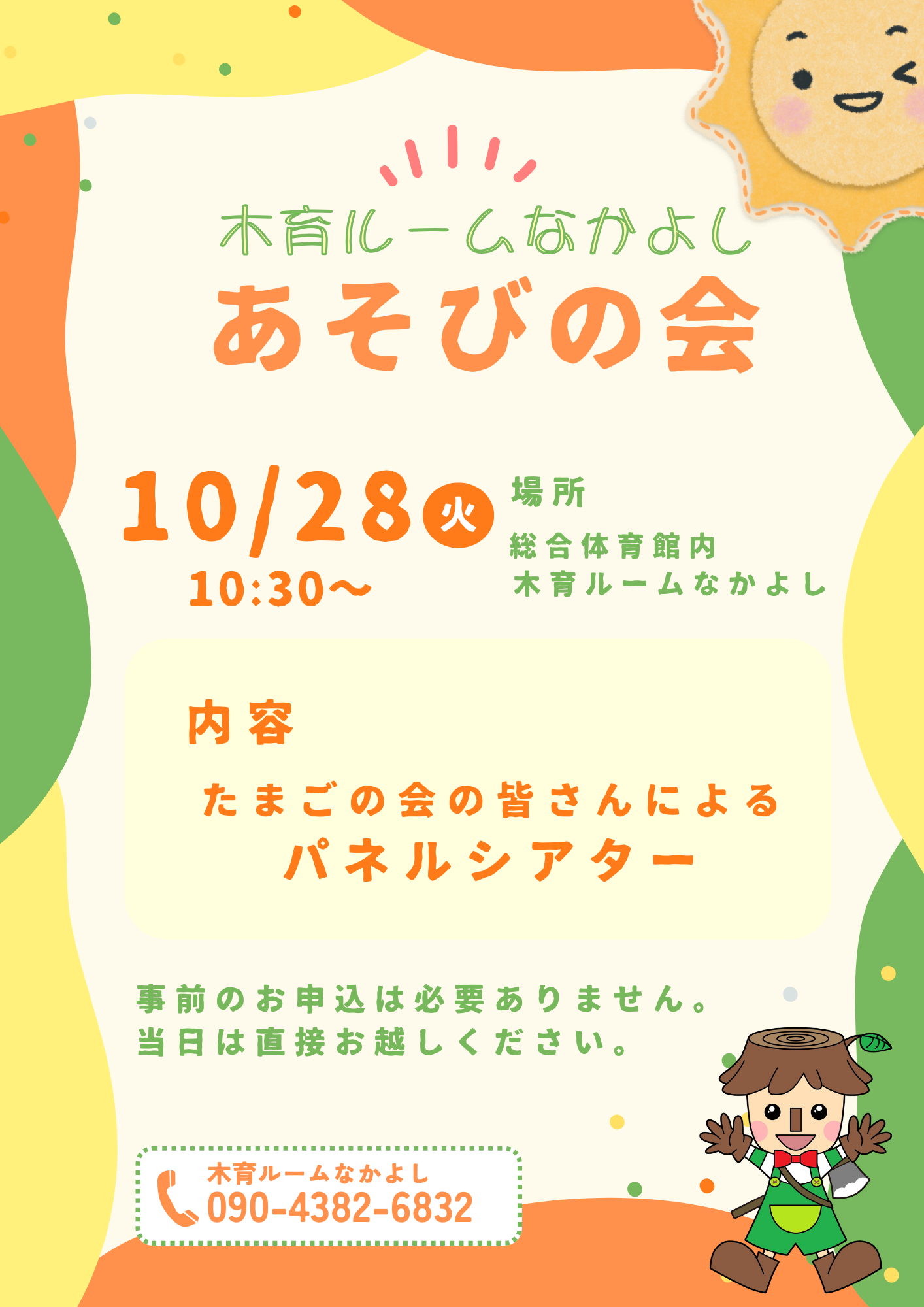 10月なかよしあそびの会 日 時 10月28日 10時30分〜 場 所 木育ルームなかよし 内 容 たまごの会の皆さんによるパネルシアターです。 何をやるかは当日のお楽しみ♪